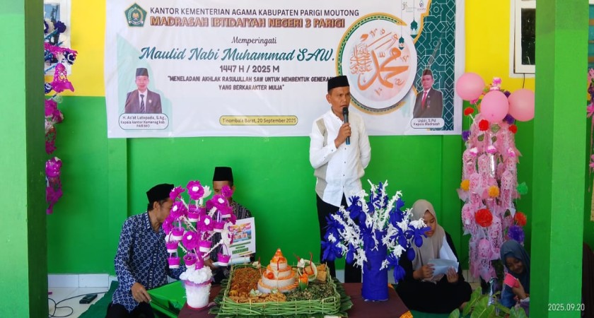 Tinombala Barat, 20 September 2025 – Keluarga besar MIN 3 Parigi menggelar peringatan Maulid Nabi Muhammad SAW 1447 H pada Sabtu pagi (20/09). Acara ini diikuti oleh seluruh siswa, dewan guru, dan staf madrasah dengan penuh semangat.